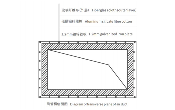 هيكل: المجلفن الصلب لوحة + الألومنيوم سيليكات مرنة حريق التفاف. يتم تقوية قطن ألياف سيليكات الألومنيوم بمحلول سيليكات الصوديوم ، ويتم وضع قطن ألياف سيليكات الألومنيوم بين الفلنجات. التثبيت: قم بتثبيت غلاف سيليكات الألومنيوم المرن المقاوم للحريق على الصفيحة الفولاذية المجلفنة بمسامير اللحام.